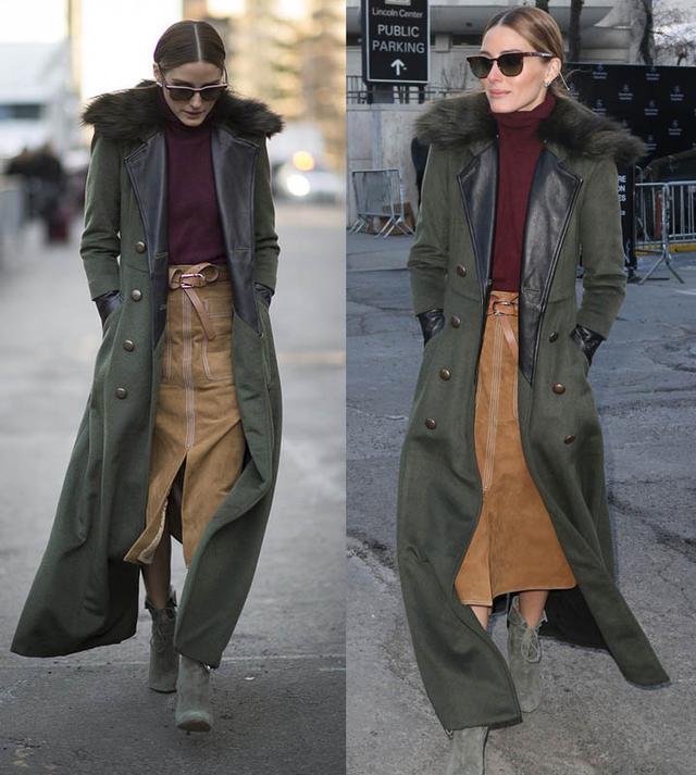 这身造型算是olivia Palermo这段日子以来比较出众的一身。棕色麂皮长裙来自于Marks and Spencer,还与Alexa Chung撞衫了呢。