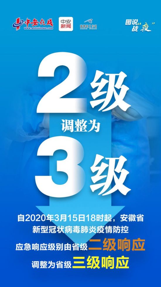 根据国家有关法律法规规定和《安徽省新型冠状病毒肺炎疫情防控应急预案(第三版)》要求,结合我省当前新型冠状病毒肺炎疫情防控形势,经研究决定,自2020年3月15日18时起,将我省新型冠状病毒肺炎疫情防控应急响应级别由省级二级响应调整为省级三级响应。