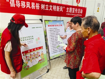 志愿者通过悬挂宣传条幅、宣传展板讲解和发放移风易俗倡议书的方式,宣传“婚庆事宜我新办、丧葬礼俗我俭办”,引导广大居民树立正确的婚丧事办理观念,改变落后风俗习惯,崇尚现代文明理念,推动社会风气美起来。