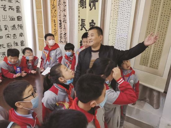 书展现场,孩子们在一幅幅作品前仔细观看、点评、写笔记。中国好人、中国书法家协会会员、全国自强模范、无臂书法家赵靖老师向孩子们介绍了有关书法知识和学习书法的意义、方法等,同时向孩子们介绍了自己失去双臂后如何坚持“口书”并成长为全国身残志坚典型的经历,激励孩子们要不断奋进拼搏。