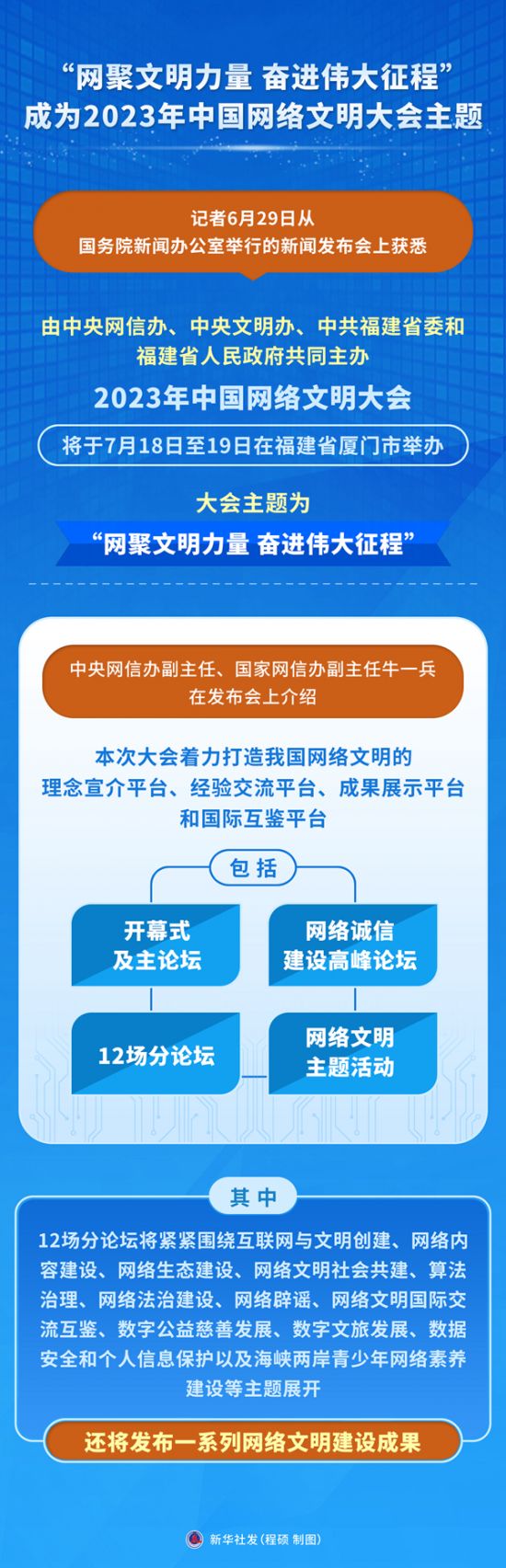 新华社北京6月29日电(记者王思北)记者29日从国务院新闻办公室举行的新闻发布会上获悉,由中央网信办、中央文明办、中共福建省委和福建省人民政府共同主办,2023年中国网络文明大会将于7月18日至19日在福建省厦门市举办,大会主题为“网聚文明力量 奋进伟大征程”。